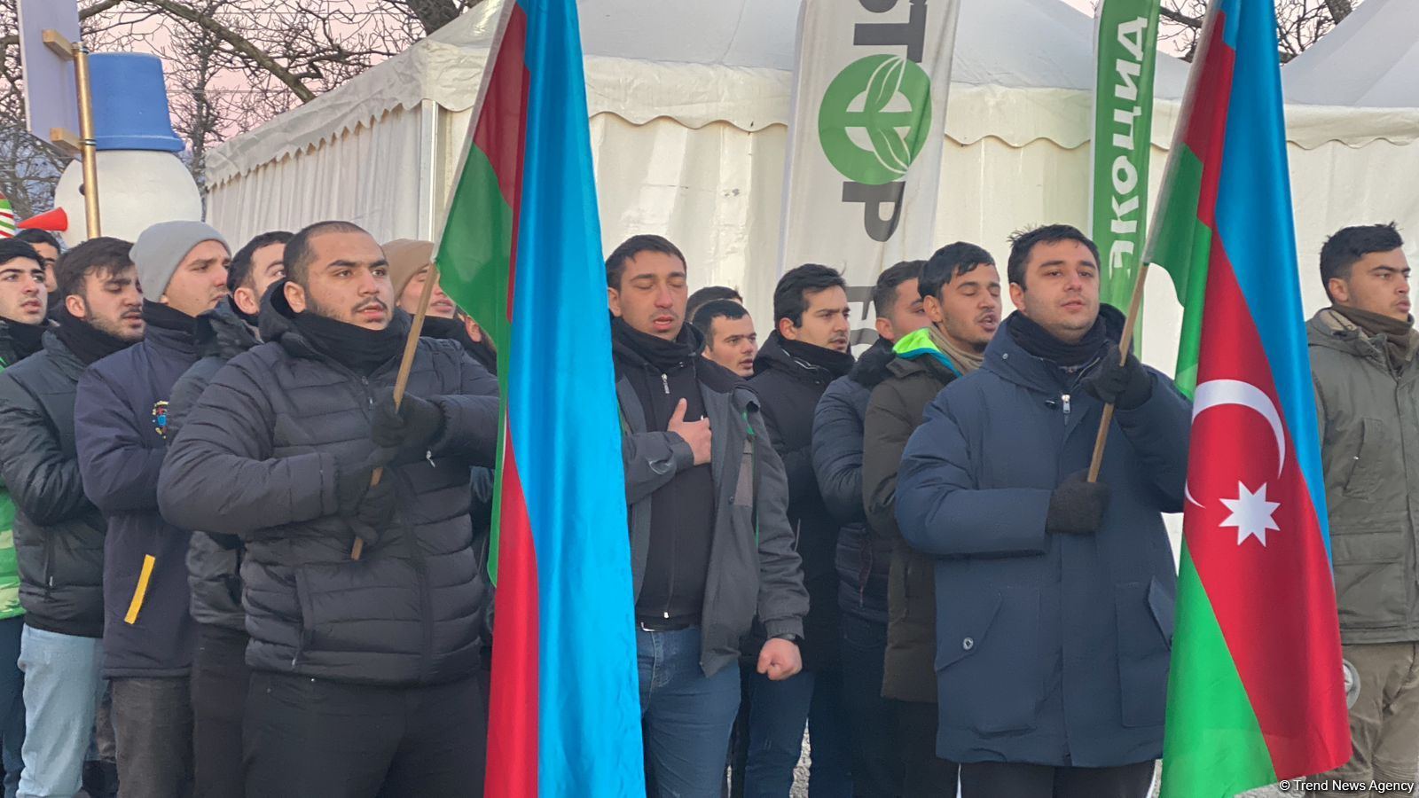 Havanın soyuq olmasına baxmayaraq aksiya iştirakçıları etirazlarını davam etdirirlər. Eko fəallar günə Azərbaycan Respublikasının Dövlət Himnin səsləndirilməsi ilə başlayıb.