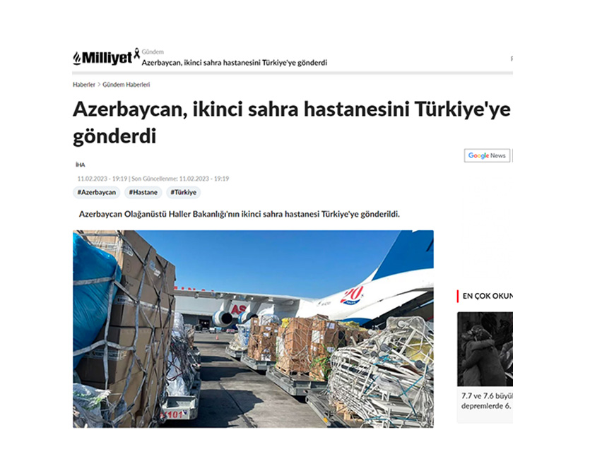 “milliyet.com” nəşrində yayımlanan məqalədə Azərbaycanın Türkiyəyə dəstəyinin davam etdiyi qeyd edilib. Bildirilib ki, Prezident İlham Əliyevin tapşırığına əsasən Türkiyədə meydana gələn şiddətli zəlzələnin nəticələrinin aradan qaldırılmasına dəstək məqsədi ilə Azərbaycan Fövqəladə Hallar Nazirliyi hər cür tibbi avadanlıq və ləvazimat ilə təchiz olunmuş ikinci səhra xəstəxanasını Türkiyəyə göndərib.