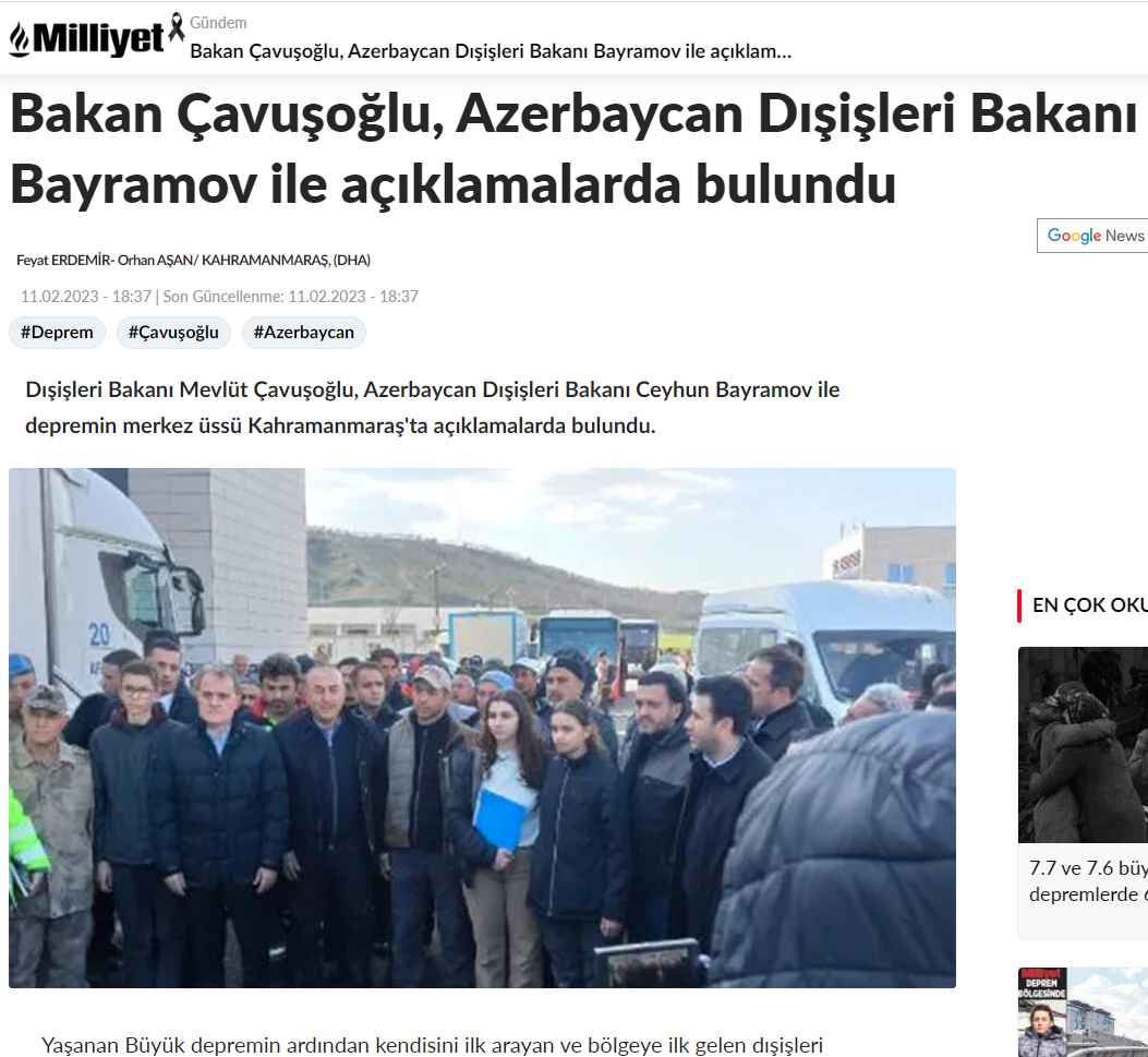 “sabah.com.tr”, “trt.net.tr”, “doğruhaber.com.tr” digər saytlarda yerləşdirilən xəbərlərdə Türkiyədə zəlzələdən sorna bölgəyə ilk gələn xarici işlər nazirinin və ilk yardım heyətinin Azərbaycan olduğu qeyd edilib. Eyni zamanda, Azərbaycanın və Türkiyənin xarici işlər nazirlərinin açıqlamaları da məqalələrdə qeyd edilib. (AZƏRTAC)