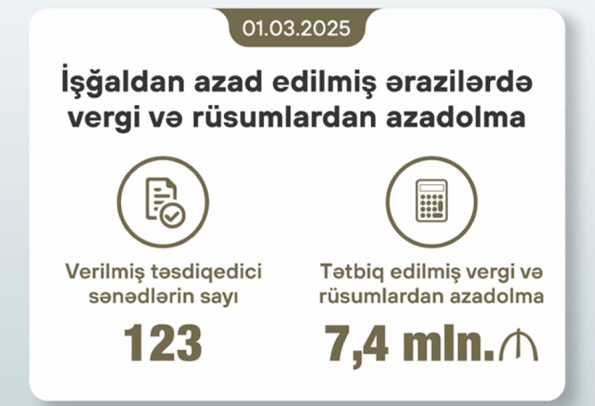 Bu il martın 1-nə işğaldan azad edilmiş ərazilərdə mövcud olan sənaye parklarının rezidentlərinə idxal olunan texnika, texnoloji avadanlıqlar, eləcə də xammala görə 123 təsdiqedici sənəd verilib ki, bu sənədlər əsasında müəssisələr tərəfindən təqribən 7,4 milyon manat dəyərində vergi və rüsumlardan azadolma tətbiq olunub.