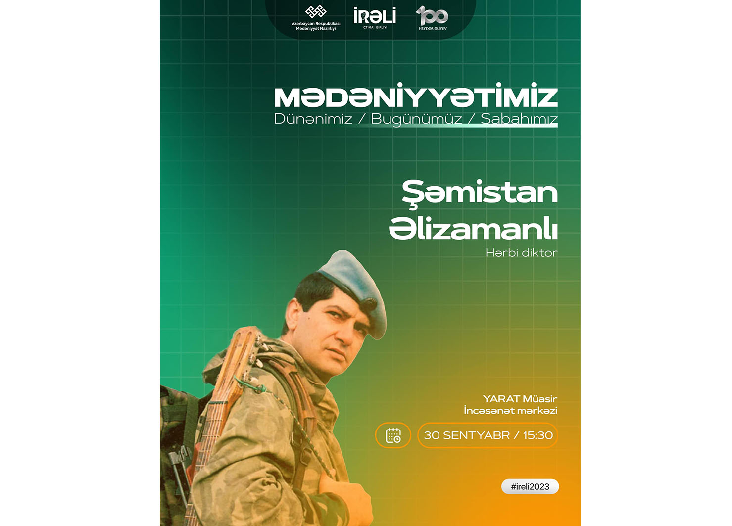Tədbir Mədəniyyət Nazirliyinin dəstəyi, “İRƏLİ” İctimai Birliyinin təşkilatçılığı ilə Ümummilli Lider Heydər Əliyevin anadan olmasının 100-cü ildönümünə həsr olunmuş “MədəniyyətimİZ” layihəsi çərçivəsində həyata keçiriləcək. Görüşdə hərbi vətənpərvərlik mahnılarının ifaçısı Şəmistan Əlizamanlı Azərbaycan gəncliyinin vətənpərvər ruhda yetişməsi kontekstində peşəkar musiqi sənətimizin təbliği, eləcə də, hərbi mövzuda yazılan musiqi əsərlərinin, opera və teatr tamaşalarının rolu istiqamətində yaradıcı sənayenin inkişafından danışacaq.