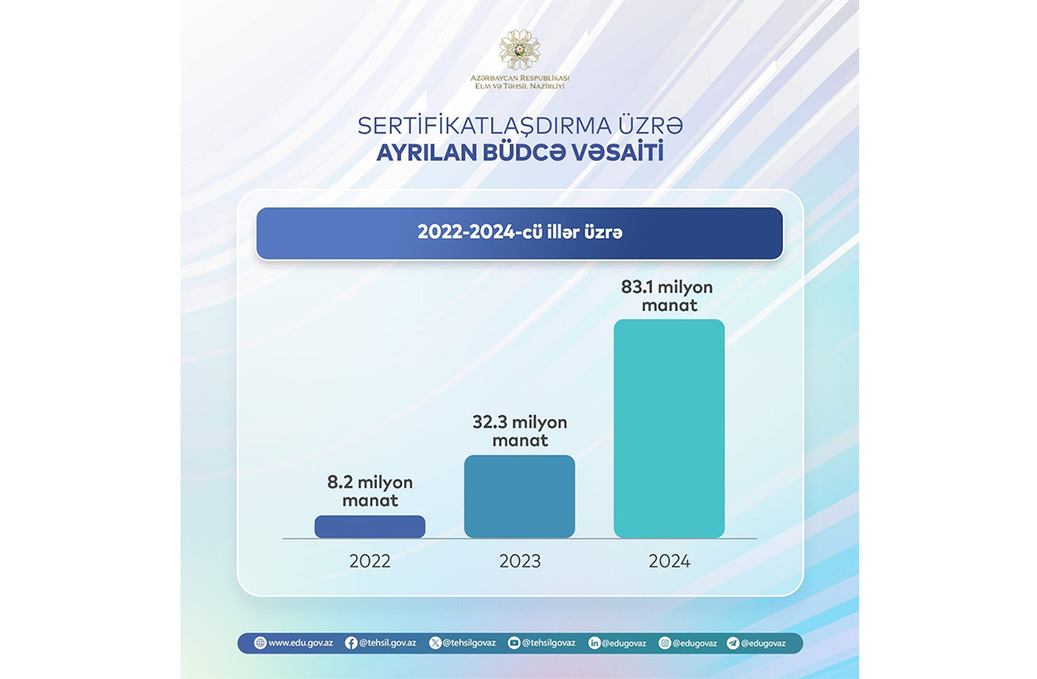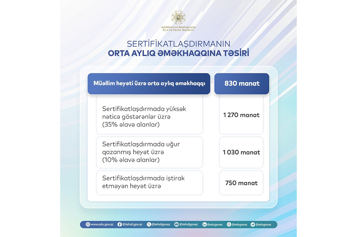 Son 2 il ərzində keçirilən sertifikatlaşdırma imtahanlarının nəticələrinə əsasən, 2023-cü ilin IV rübü üzrə təhsilverənlərin orta aylıq əməkhaqqı 830 manata çatacaq.