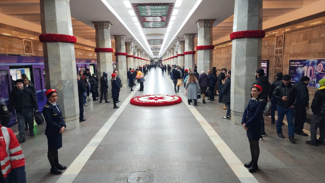 Stansiyada platformanın sütunlarına qərənfillərdən çələnglər qoyulub. Platformanın əsas giriş vestibülünün ön hissəsində üzərinə “20 Yanvar. Unutmadıq, unutmayacağıq” ifadələri yazılmış qərənfillərdən kompozisiya yerləşdirilib. Şəhidlərimizin əziz xatirəsinə xüsusi ehtiramın əlaməti kimi günorta saatlarına qədər platformada hər iki stansiya yolu boyunca işçilərdən ibarət qarovul dəstəsi düzülüb.