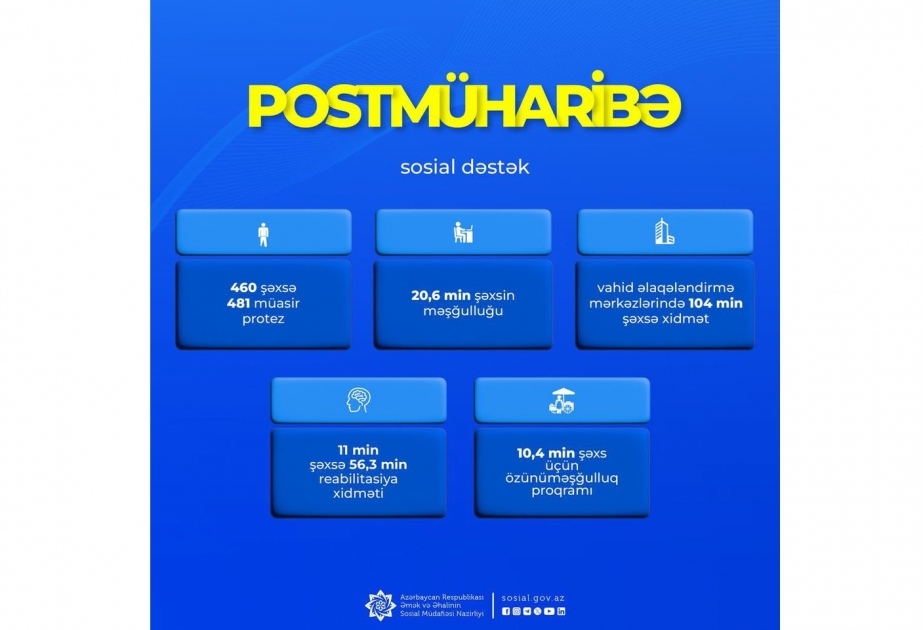 Postmüharibə dövründə qeyd olunan sosial dəstək paketi 126 min şəxsi əhatə edərək, onlara dəstək yönümlü 326 min xidmət göstərilib.