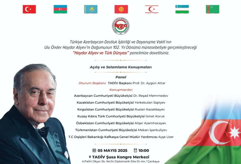 TADİV-in rəhbəri, professor Aygün Attar bildirib ki, mayın 5-də Vəqfin Ankaranın Oran rayonunda yerləşən “Şuşa” Konqres Mərkəzində “Heydər Əliyev və Türk dünyası” mövzusunda panel müzakirələri keçiriləcək. Müzakirələrdə türk ölkələrinin səfirlikləri, eləcə də Türkiyə Xarici İşlər Nazirliyinin nümayəndələrinin iştirakı nəzərdə tutulub.