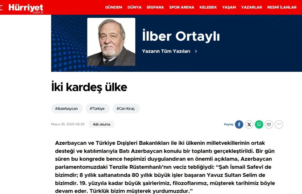 Bu barədə bazar günü Türkiyənin “Hürriyet” qəzetində dərc olunan tanınmış türkiyəli tarixçi, professor İlber Ortaylının məqaləsində qeyd olunur.