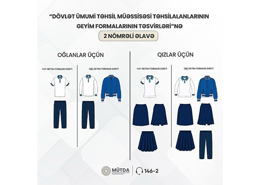 Xatırladaq ki, 2022-ci ildə hər bir ümumi təhsil müəssisəsinin Pedaqoji Şurası tərəfindən 4 növ geyim formasından birinin tətbiqi ilə bağlı müvafiq qərar qəbul edib. Valideynlər, xüsusilə övladları birinci sinfə gedənlər Agentliyin və yerli bölmələrinin Çağrı Mərkəzi, eləcə də uşaqlarının təhsil alacağı məktəbdən bu barədə ətraflı məlumat əldə edə bilərlər.