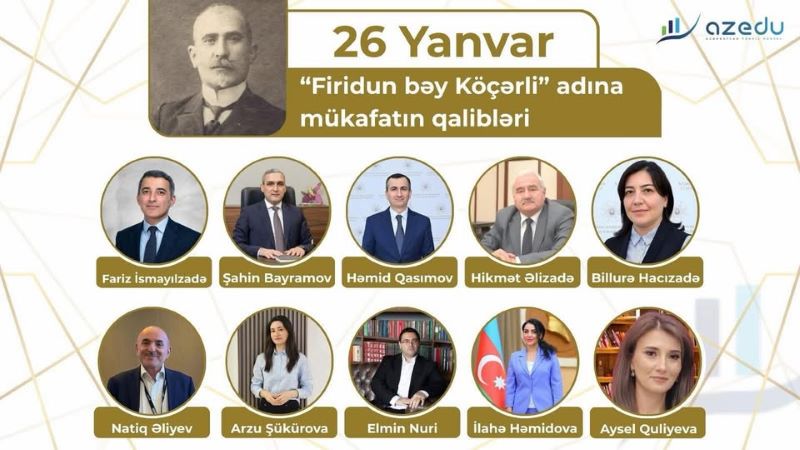 AzEdu.az Təhsil Portalı tərəfindən təsis edilmiş “Firidun bəy Köçərli” mükafatına bu il 10 nəfər layiq görülüb. Portalın ekspert qrupunun apardığı geniş müzakirə və qiymətləndirmələr nəticəsində seçilən namizədlər təhsil sahəsindəki səmərəli fəaliyyətlərinə görə mükafatlandırılıblar.
