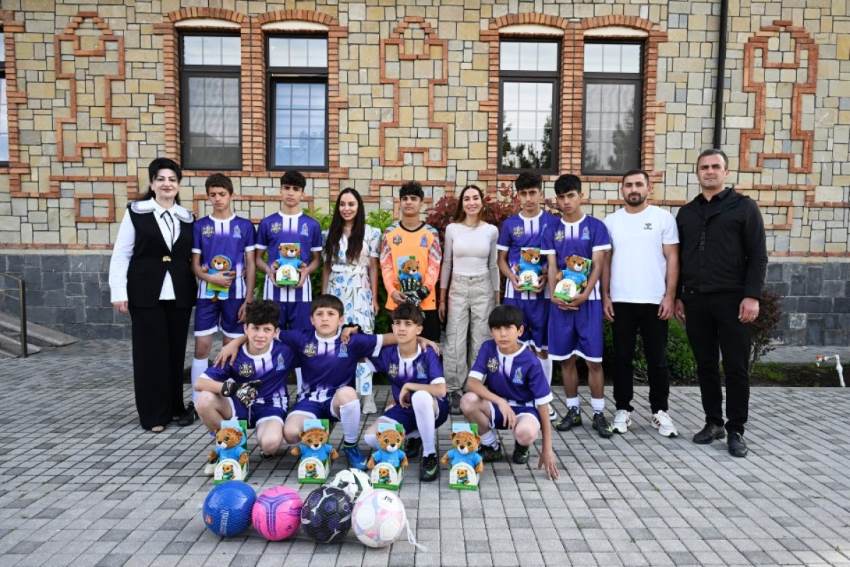 Sonda müəssisənin kollektivi və uşaqlar ilə xatirə şəkilləri çəkdirilib, hədiyyələr təqdim edilib. (APA)