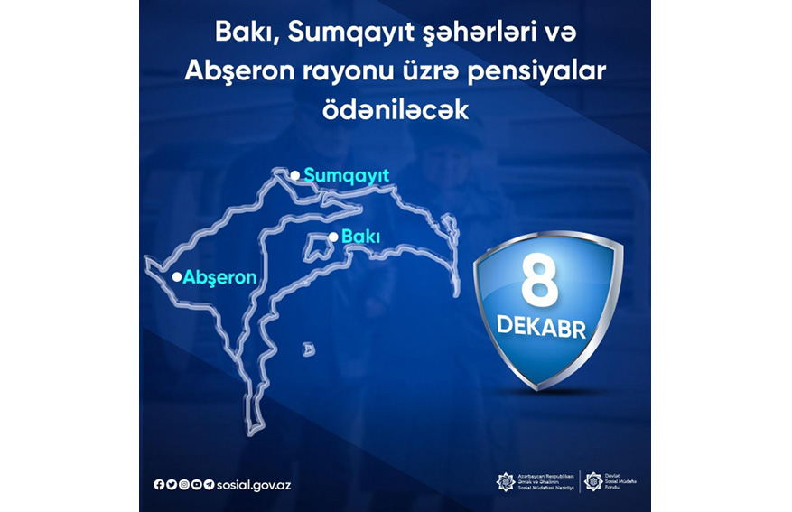 Dekabrın 8-də Bakı və Sumqayıt şəhərləri, eləcə də Abşeron rayonu üzrə pensiyaların ödənilməsi nəzərdə tutulub.