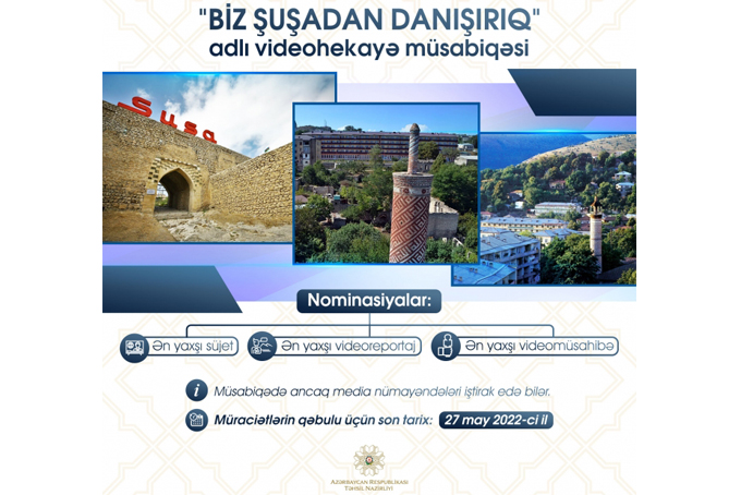 - İştirakçı özü haqqında zəruri məlumatları (adı, soyadı, yaşı, yaşadığı şəhərin (rayonun adı), təmsil etdiyi media qurumunun adı və tutduğu vəzifə, əlaqə telefonu) daxil etməklə hazırlanmış videonu mayın 27-dək musabiqe2022@edu.gov.az ünvanına göndərməlidir;