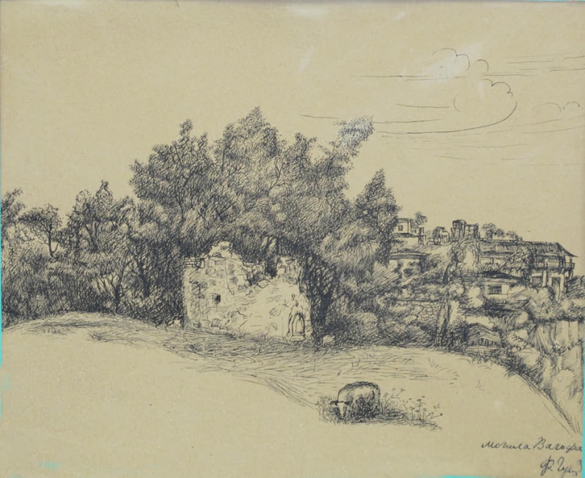 Teatr rəssamı Fyodor Qusak tərəfindən çəkilmiş və Cəfər Cabbarlı adına Azərbaycan Dövlət Teatr Muzeyinin fondunda qorunan bu eskizdə dahi şairimiz, ictimai xadim Molla Pənah Vaqifin məzarının təsviri verilib. Eskizdən də göründüyü kimi şairin dəfnindən sonra onun məzarı üzərində kiçik bir türbə tikilibmiş. Tariximizin silinməsi istiqamətində aparılan siyasət nəticəsində sonralar o, ermənilər tərəfindən dağıdılıb. Rəssam Fyodor Qusak türbənin məhz dağıntıdan sonrakı mənzərəsinin təsvirini verib. Əsər tariximizin bu məqamını görükdürən danılmaz bir fakt kimi böyük əhəmiyyət kəsb edir.