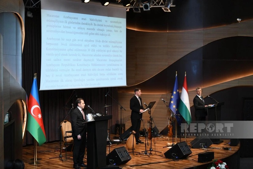 Macarıstanın Azərbaycandakı səfirliyinin təşkilatçılığı ilə keçirilən tədbir hər iki ölkənin dövlət himnlərinin səsləndirilməsi ilə başlayıb.