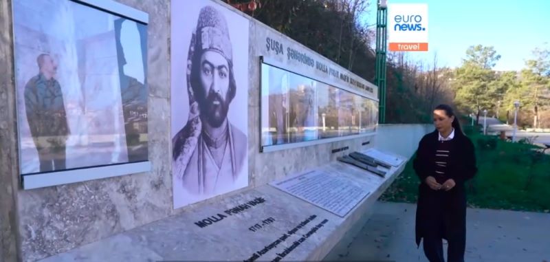 Vaqif məqbərəsindən danışarkən kanalın müxbiri qeyd edir ki, bura sakit düşüncələr yeridir, şəhəri formalaşdıran şairlərdən birinin şərəfinədir və Şuşa daşından tikilib.