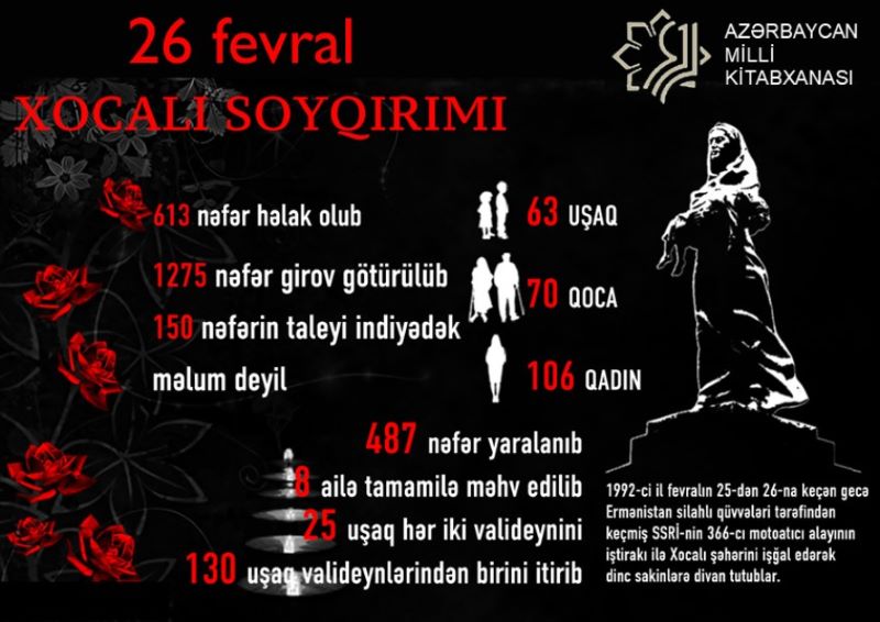 Kitabxanadan bildirilib ki, “26 fevral - Xocalı soyqırımı” adlı virtual sərgidə azərbaycanlılara qarşı apardığı soyqırım siyasəti, işğaldan azad edilmiş ərazilərdə aşkarlanan kütləvi məzarlıqlar, ağlasığmaz qəddarlıqla törədilmiş dəhşətli faciələr haqqında dövri mətbuatda çap olunan məqalələr, Azərbaycan və müxtəlif dillərdə ədəbiyyatlar və fotolar nümayiş olunur.