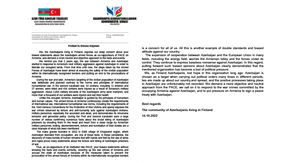 İsveç və Finlandiyada yaşayan Azərbaycan icmasının üzvləri Avropa Şurası Parlament Assosiasiyasının (AŞPA) Ermənistan üzrə həmməruzəçilərinə - isveçli deputat Boriana Oberginə və finlandiyalı deputat Kimmo Kilyunenə müraciət ediblər.
